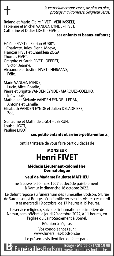 Décédé à Namur (5000) le dimanche 16 octobre 2022 à l'âge de 95 ans