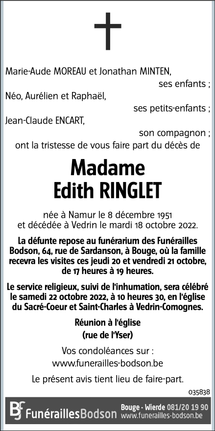 Décédée à Vedrin (5020) le mardi 18 octobre 2022 à l'âge de 70 ans