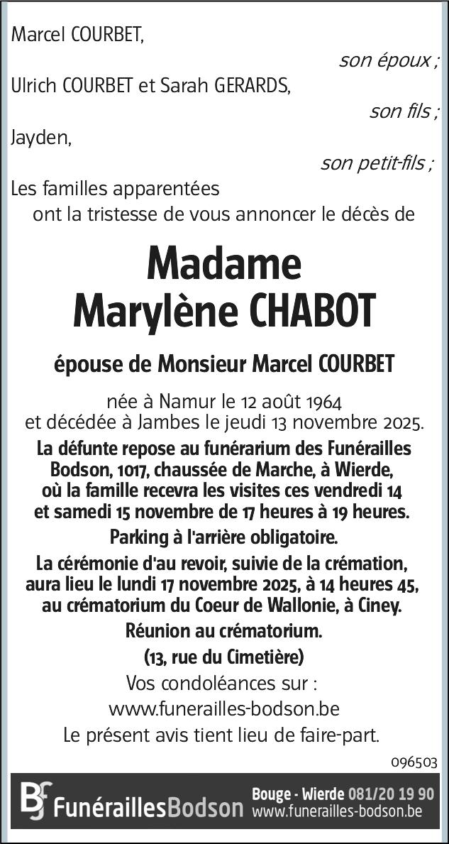 Décédée à Jambes (5100) le jeudi 13 novembre 2025 à l'âge de 61 ans