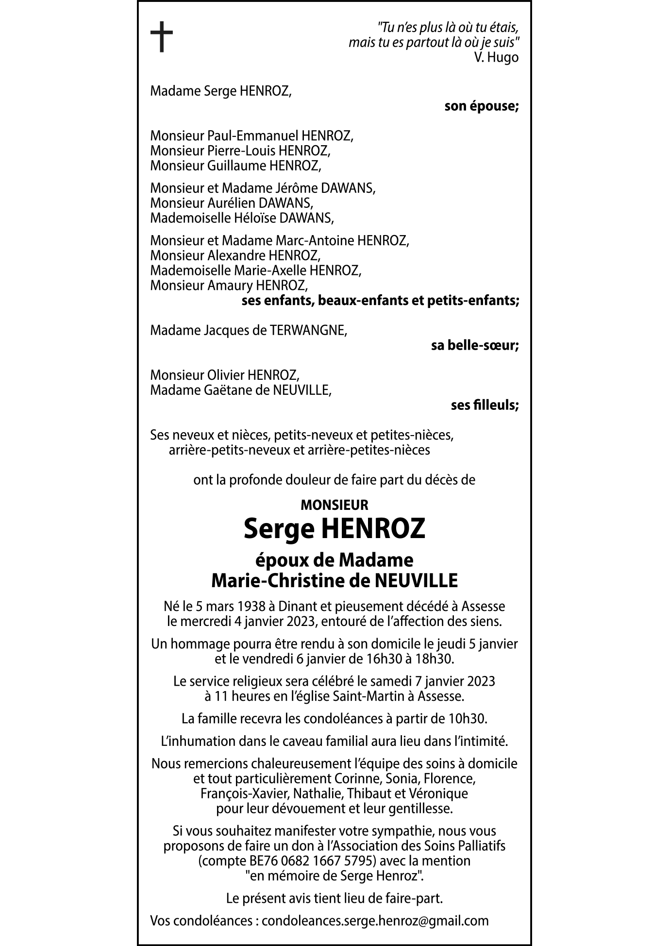 Décédé à Assesse (5330) le mercredi 4 janvier 2023 à l'âge de 84 ans