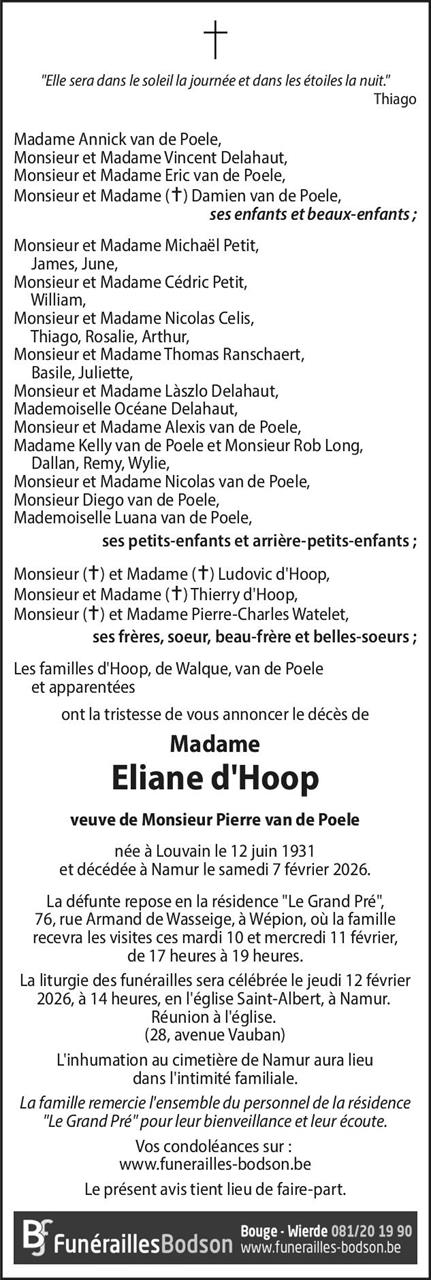 Décédée à Wépion (5100) le samedi 7 février 2026 à l'âge de 94 ans