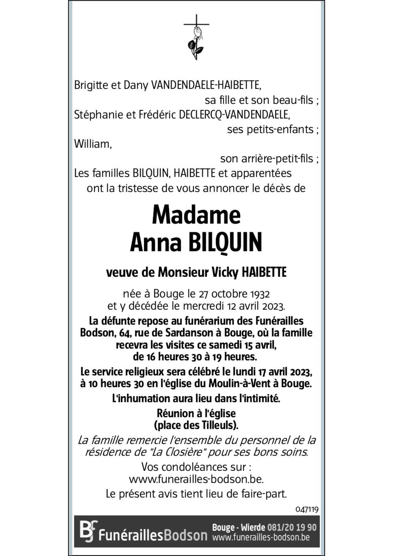 Décédée à Bouge (5004) le mercredi 12 avril 2023 à l'âge de 90 ans