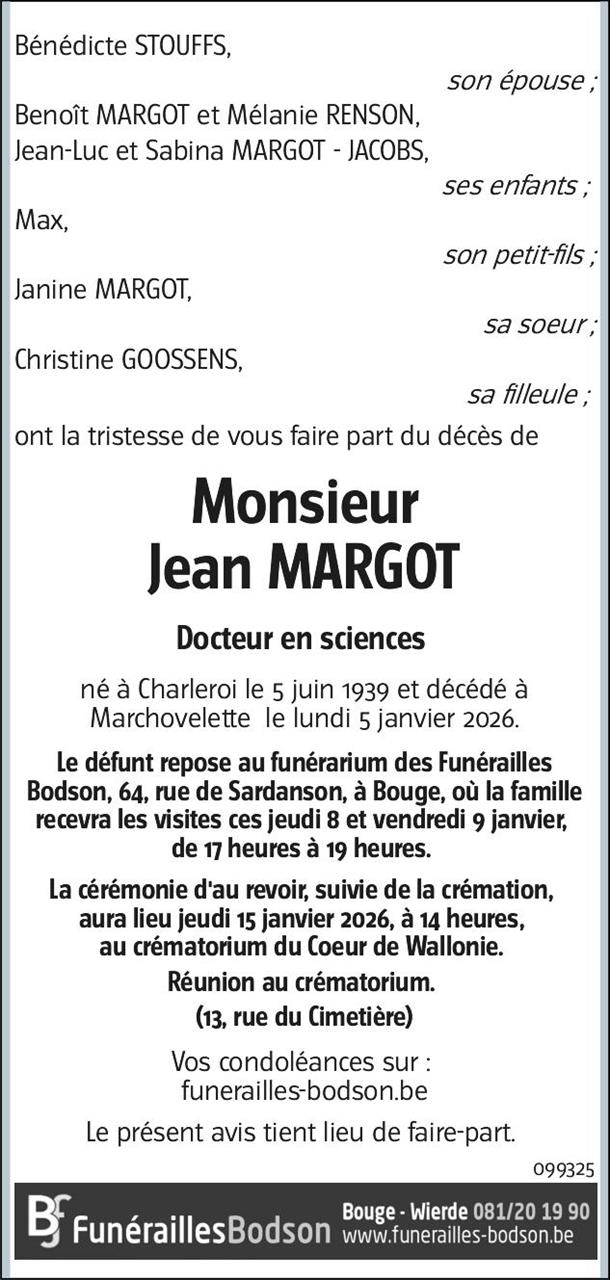 Décédé à Fernelmont (5380) le lundi 5 janvier 2026 à l'âge de 86 ans