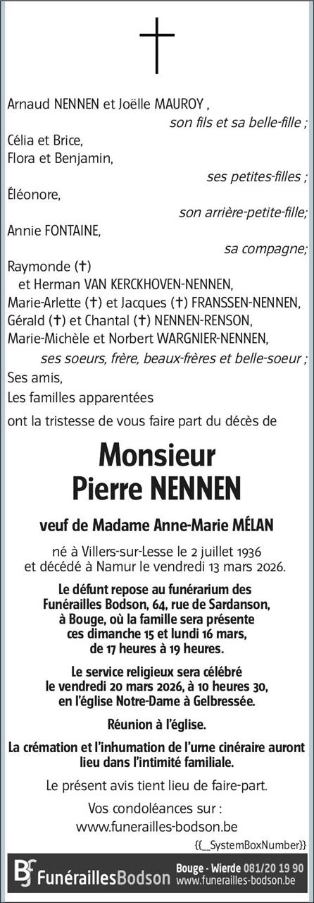 Décédé à Namur (5000) le vendredi 13 mars 2026 à l'âge de 89 ans