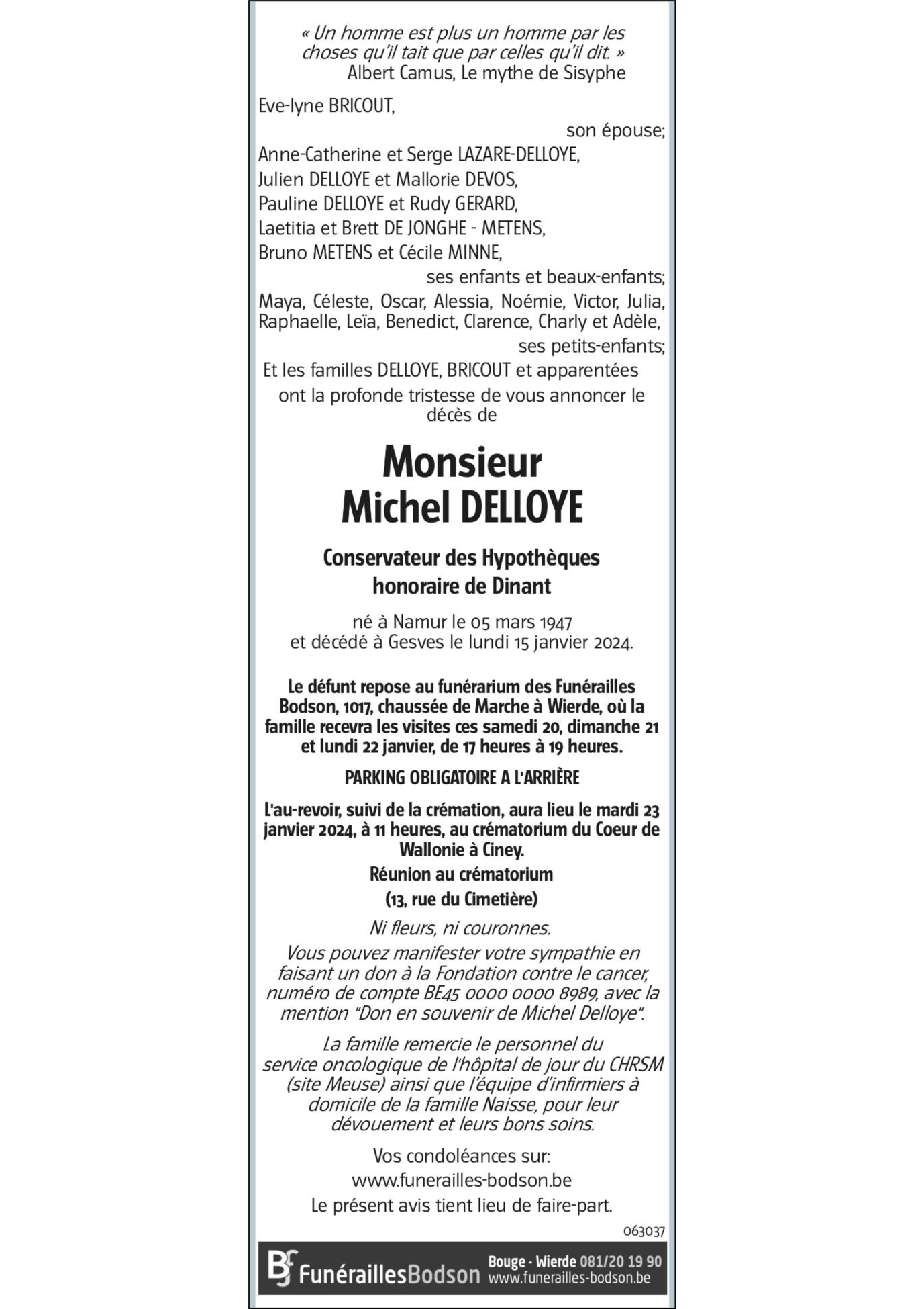 Décédé à Gesves (5340) le lundi 15 janvier 2024 à l'âge de 76 ans