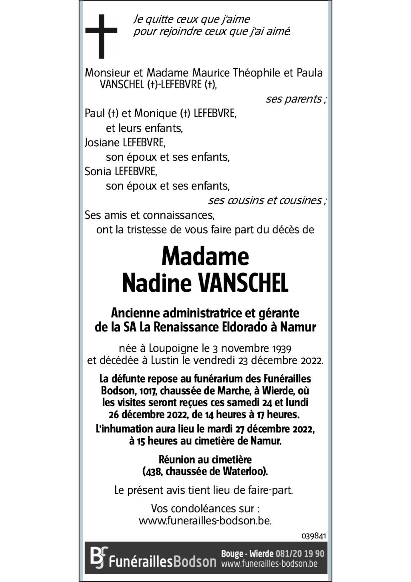 Décédée à Lustin (5170) le vendredi 23 décembre 2022 à l'âge de 83 ans