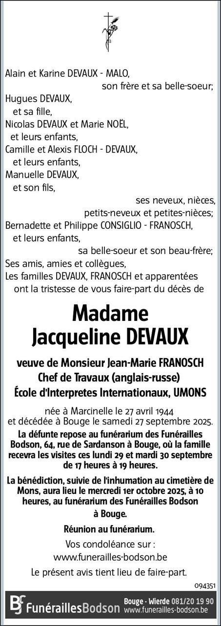 Décédée à Bouge (5004) le samedi 27 septembre 2025 à l'âge de 81 ans