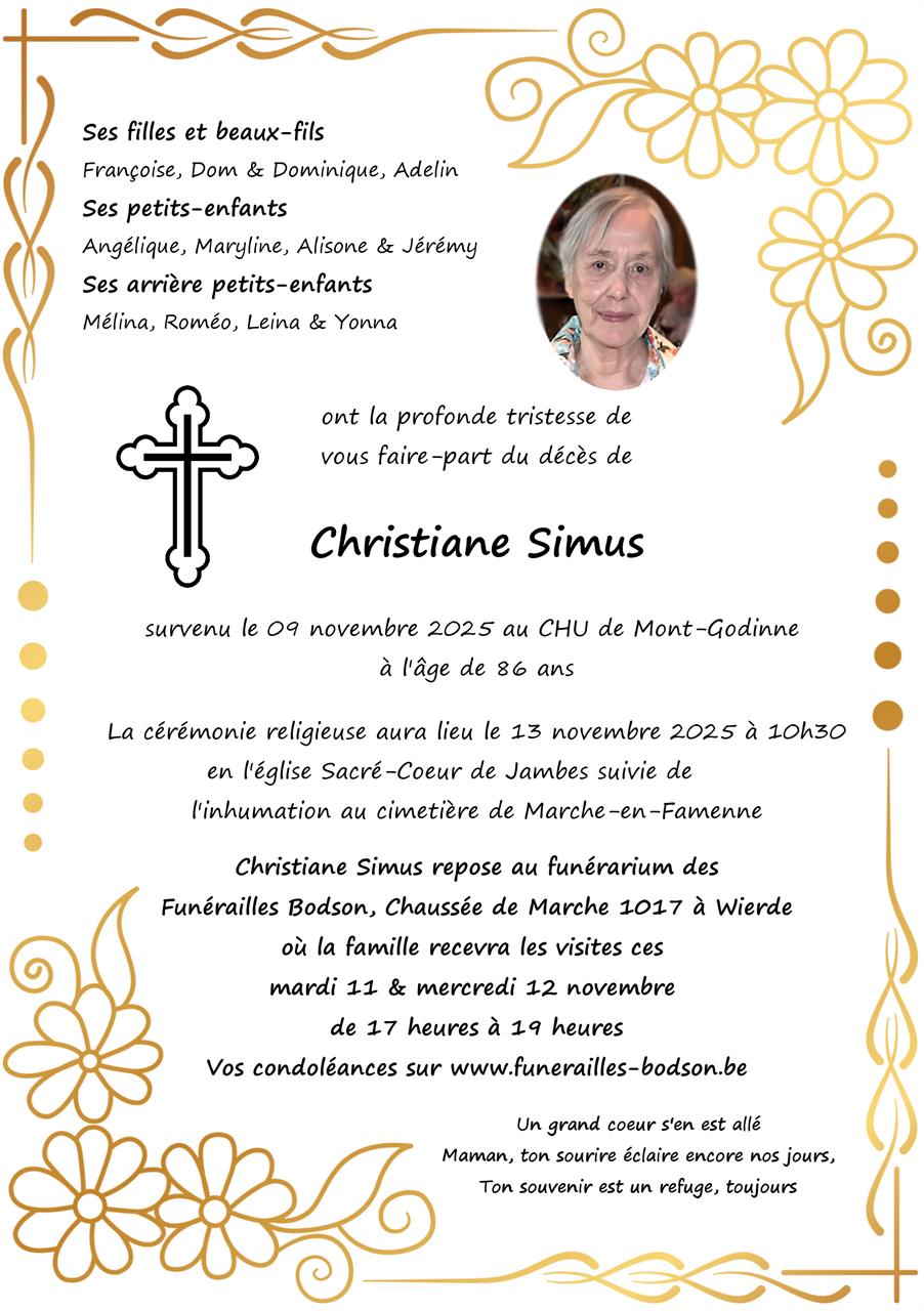 Décédée à Yvoir (5530) le dimanche 9 novembre 2025 à l'âge de 86 ans